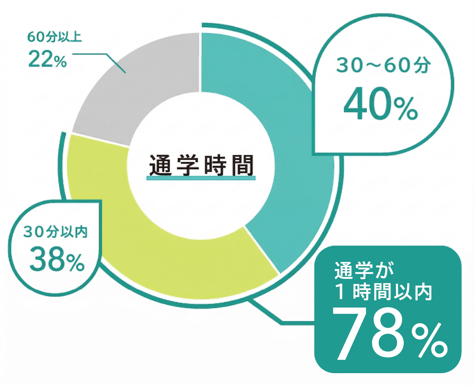 天使大学はアクセスの良さが魅力のひとつです。全学生の81%が通学時間1時間以内で通える環境にあり、JR札幌駅からは地下鉄でわずか12分、さらに地下鉄東豊線『北13条東駅』から徒歩3分という便利な立地です。