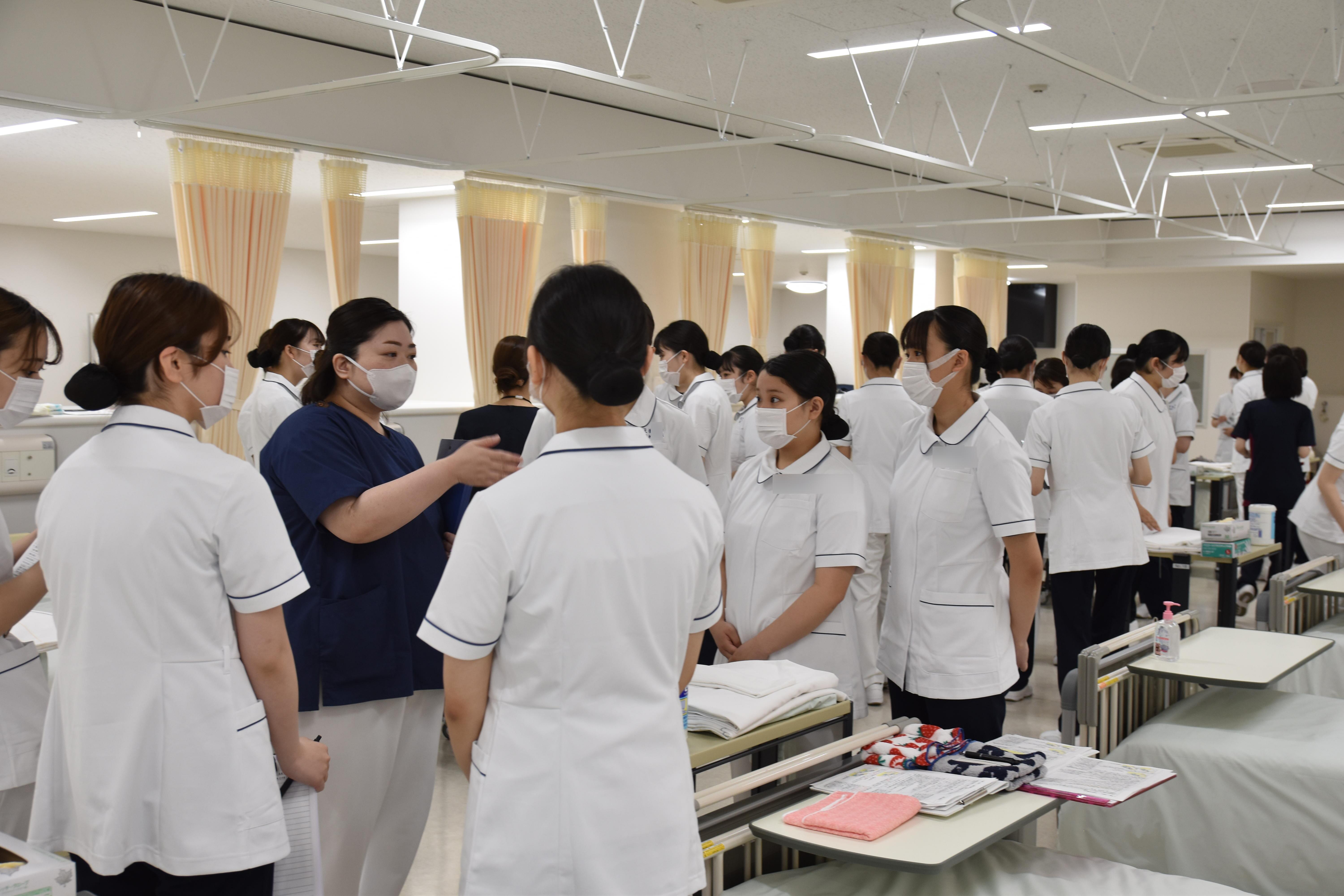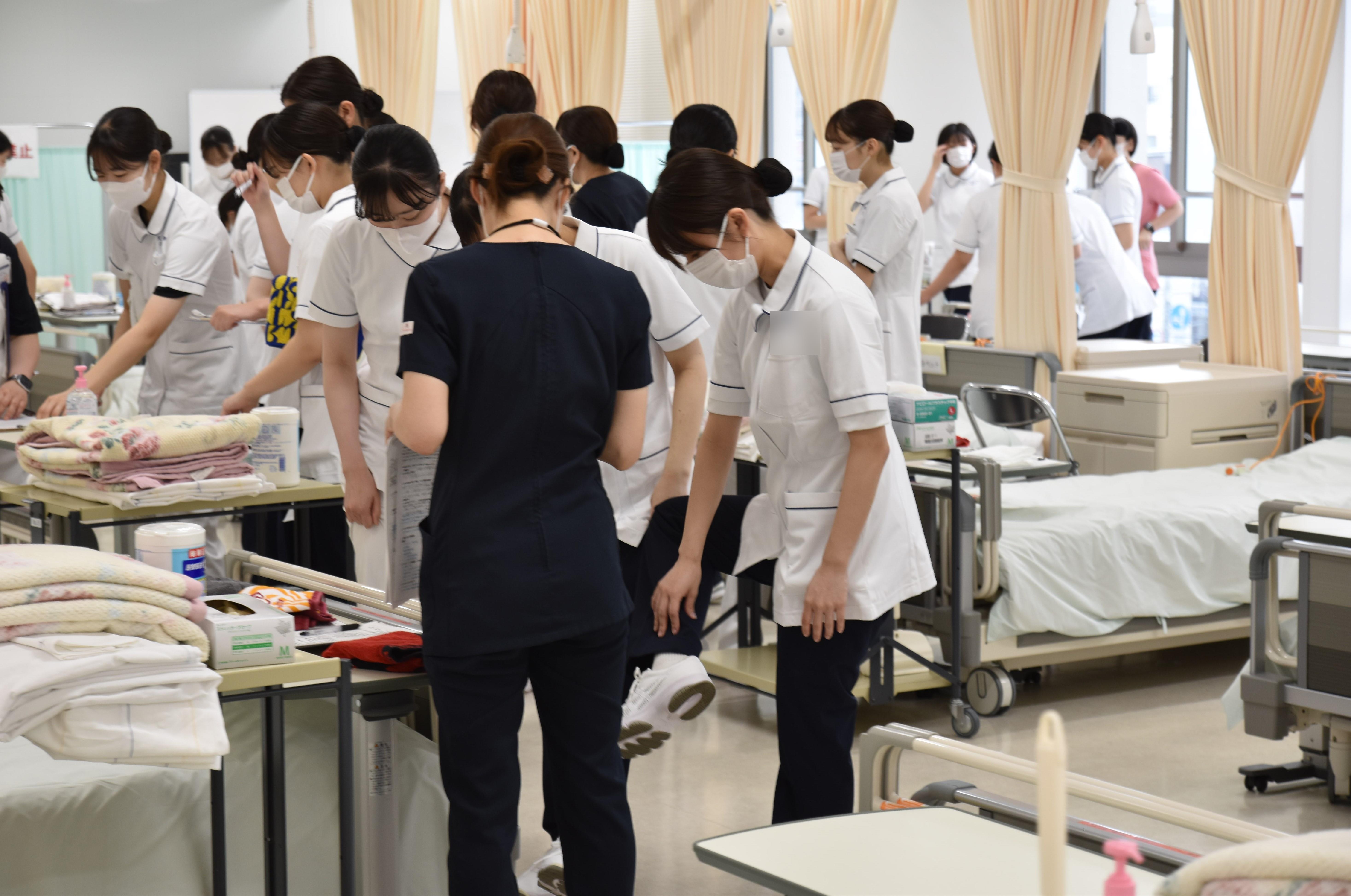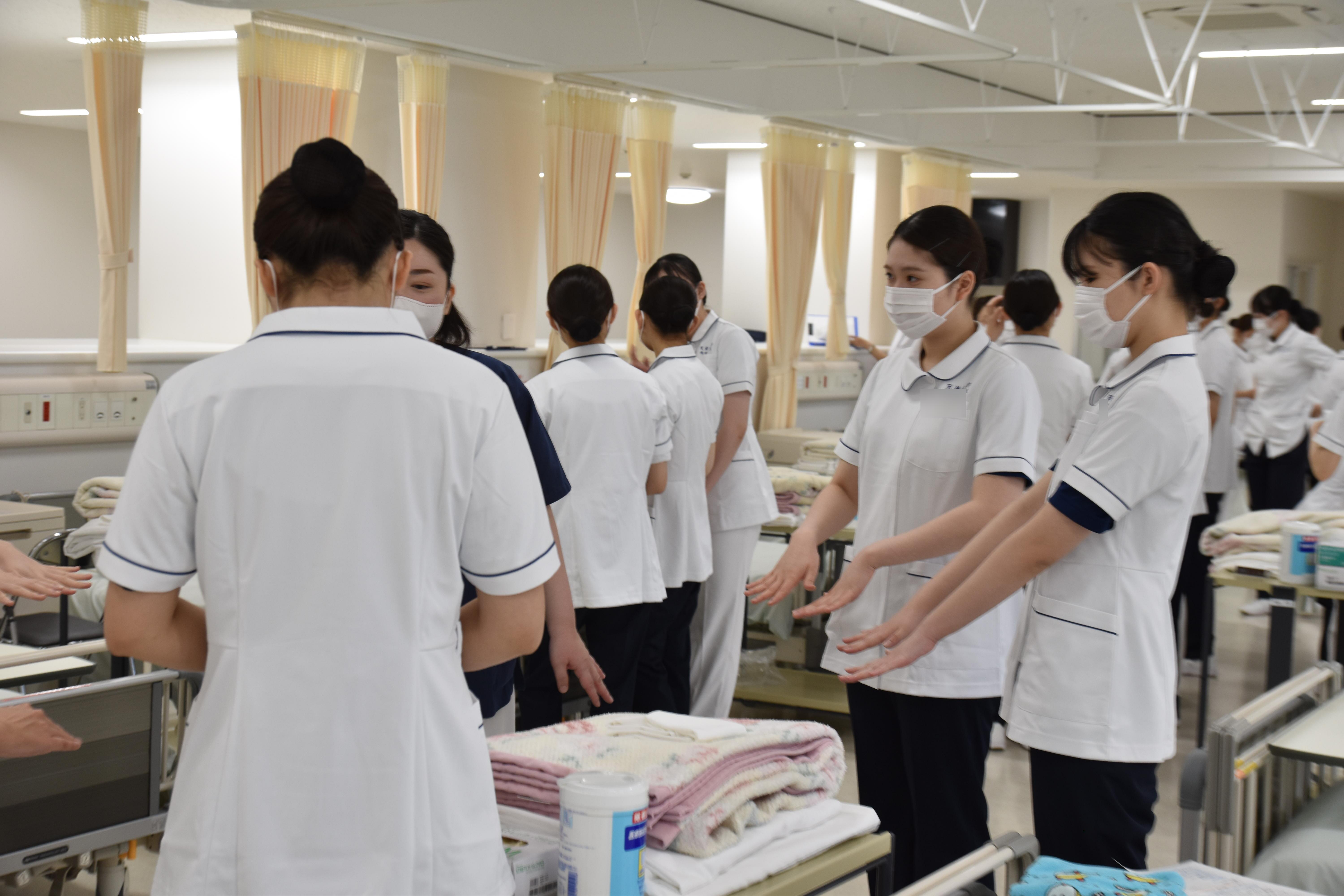 清潔と汚染を意識してリネン交換を行い、患者の安全性と安楽性を考え、お互いに声を掛け合いながら実践しました。定められた時間で、安全に素早く丁寧に行うことが要求され、学生達は、時間オーバーしながらも真剣に取り組みました。