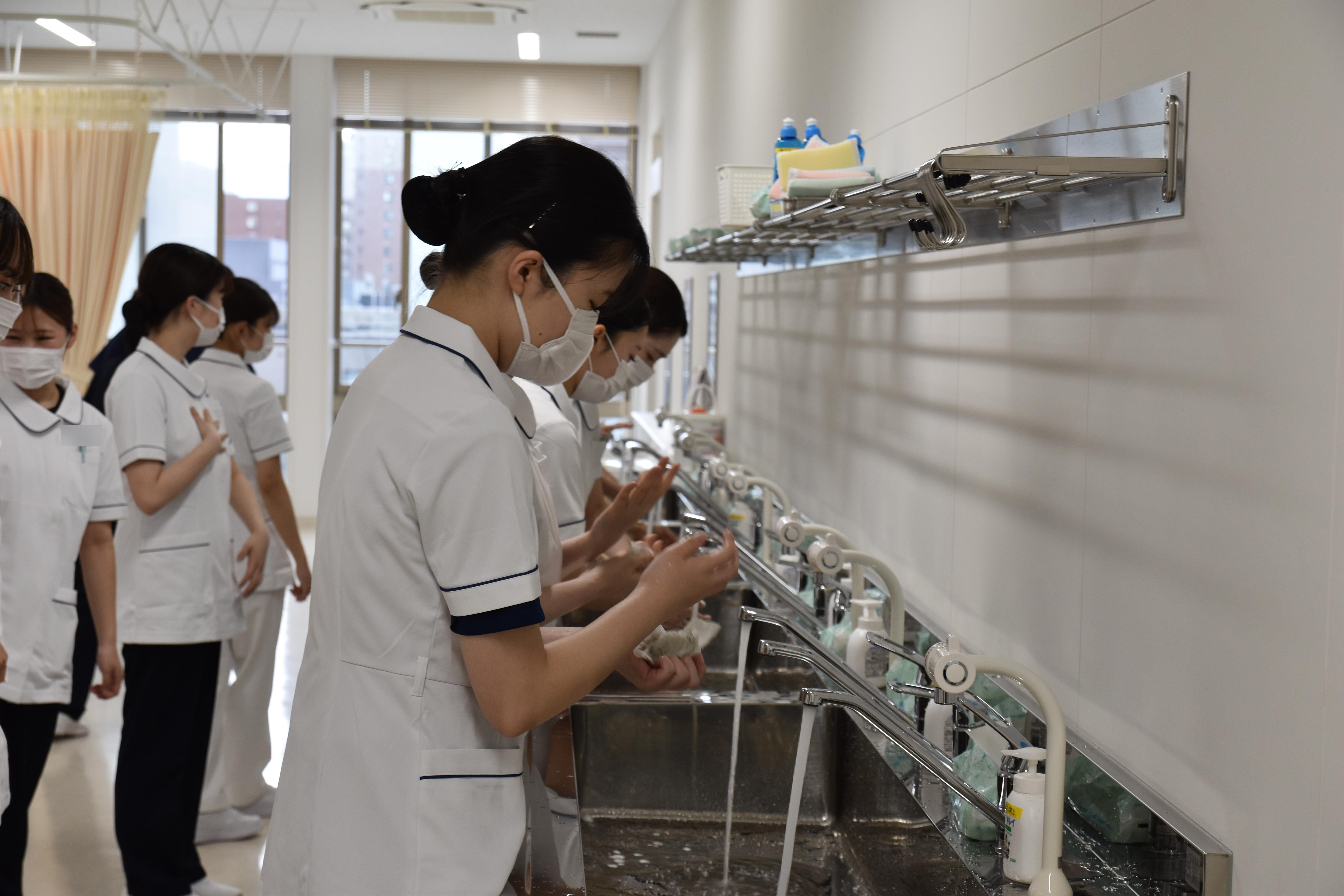 学生達は、本日よりまだ着慣れぬ実習着での演習となり、教員に身だしなみを指導されてからの演習となりました。