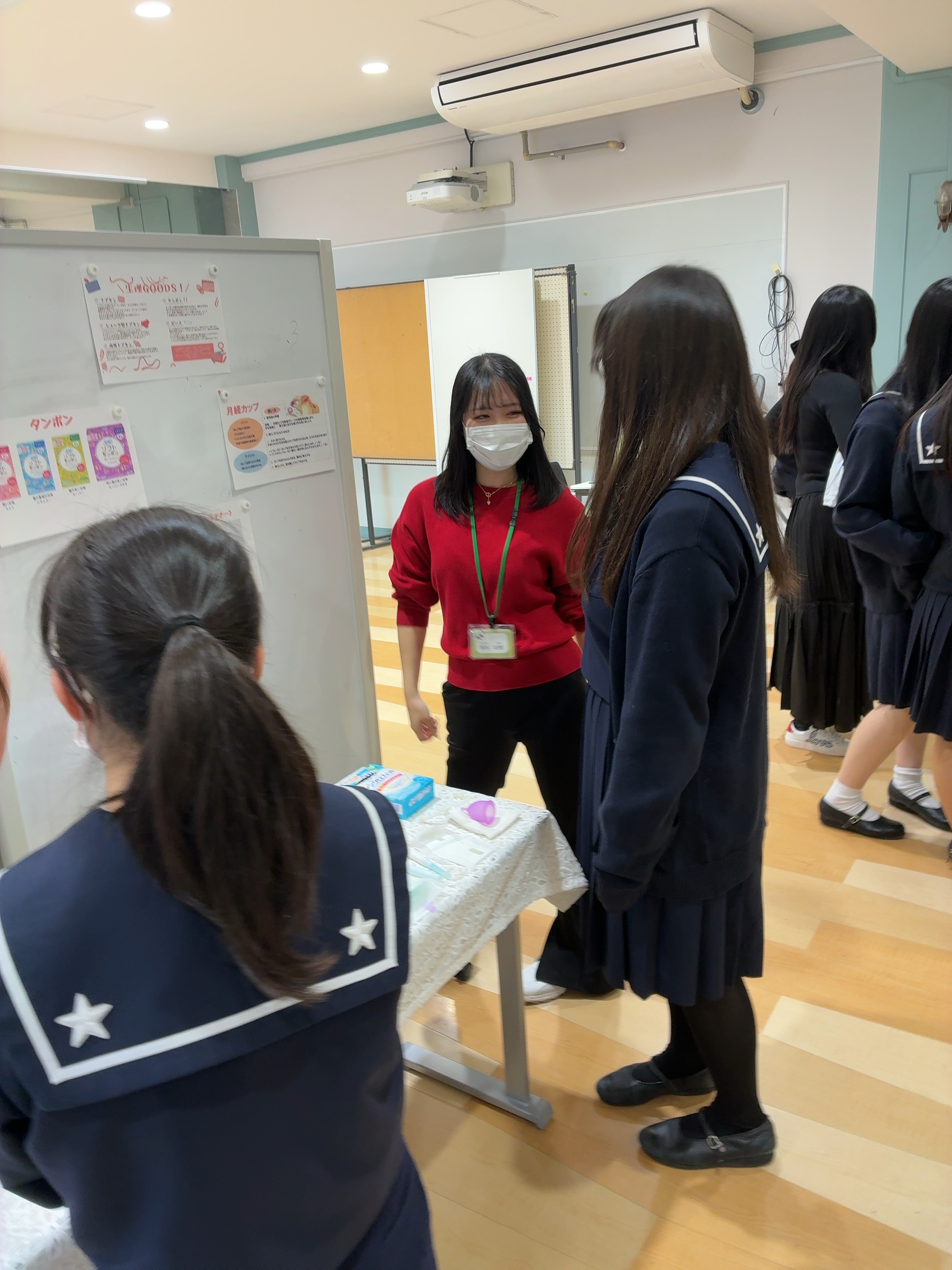 授業内容としては月経、妊娠・出産、避妊・感染症、デートDVなど、現代の高校生にとって必要な知識や、私たち助産学生だからこそ伝えることが出来る具体的な内容を提供出来るようにしました。特に低用量ピルの体験談や実際のお産の映像などは生徒さんからも「分かりやすい、イメージしやすい」という感想を頂き、自身の将来についてより具体的に理解を深めてもらうことに繋がったと感じています。また、休憩時間にも赤ちゃん人形や月経用品などの展示をたくさんの生徒さんに体験してもらうことが出来ました。