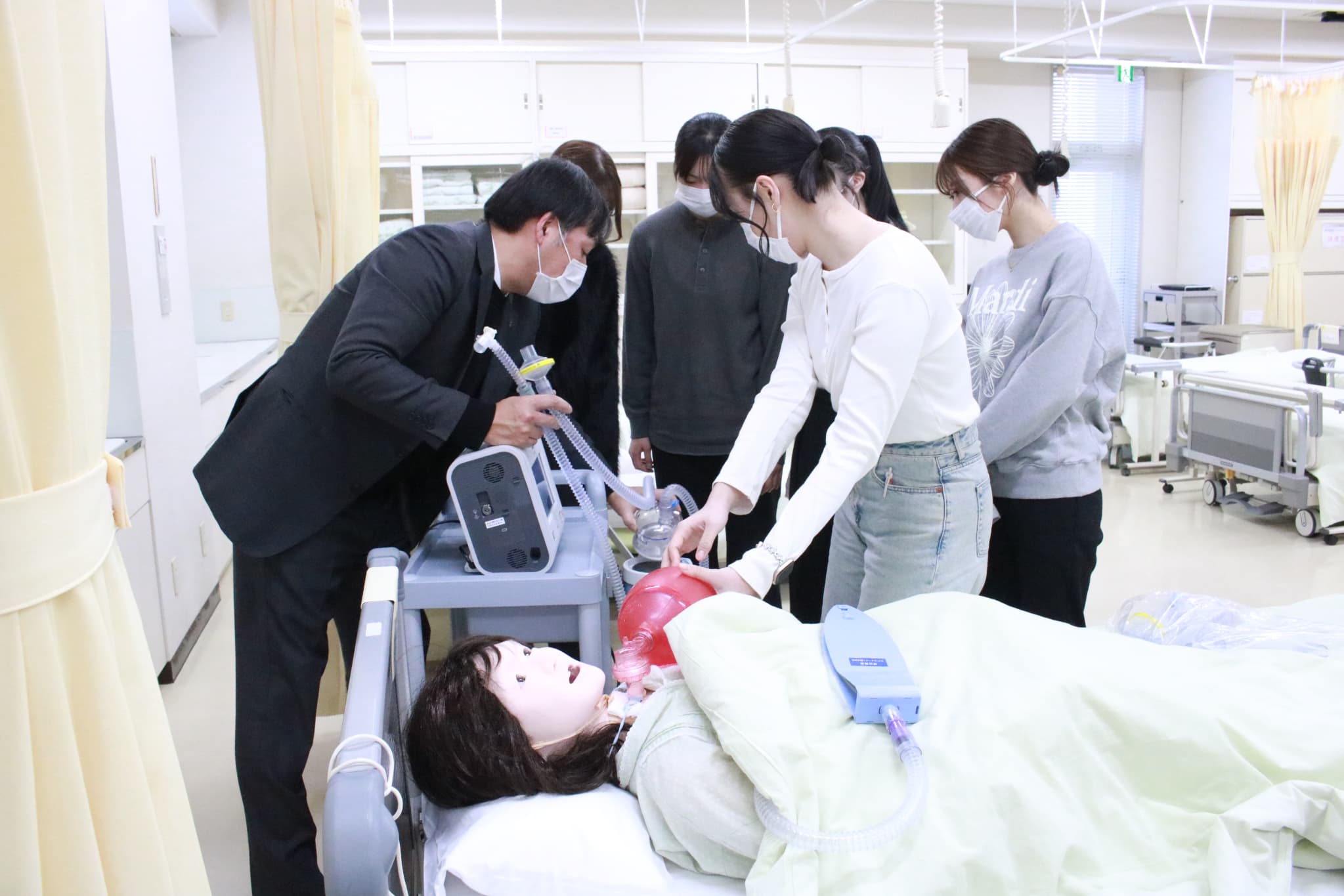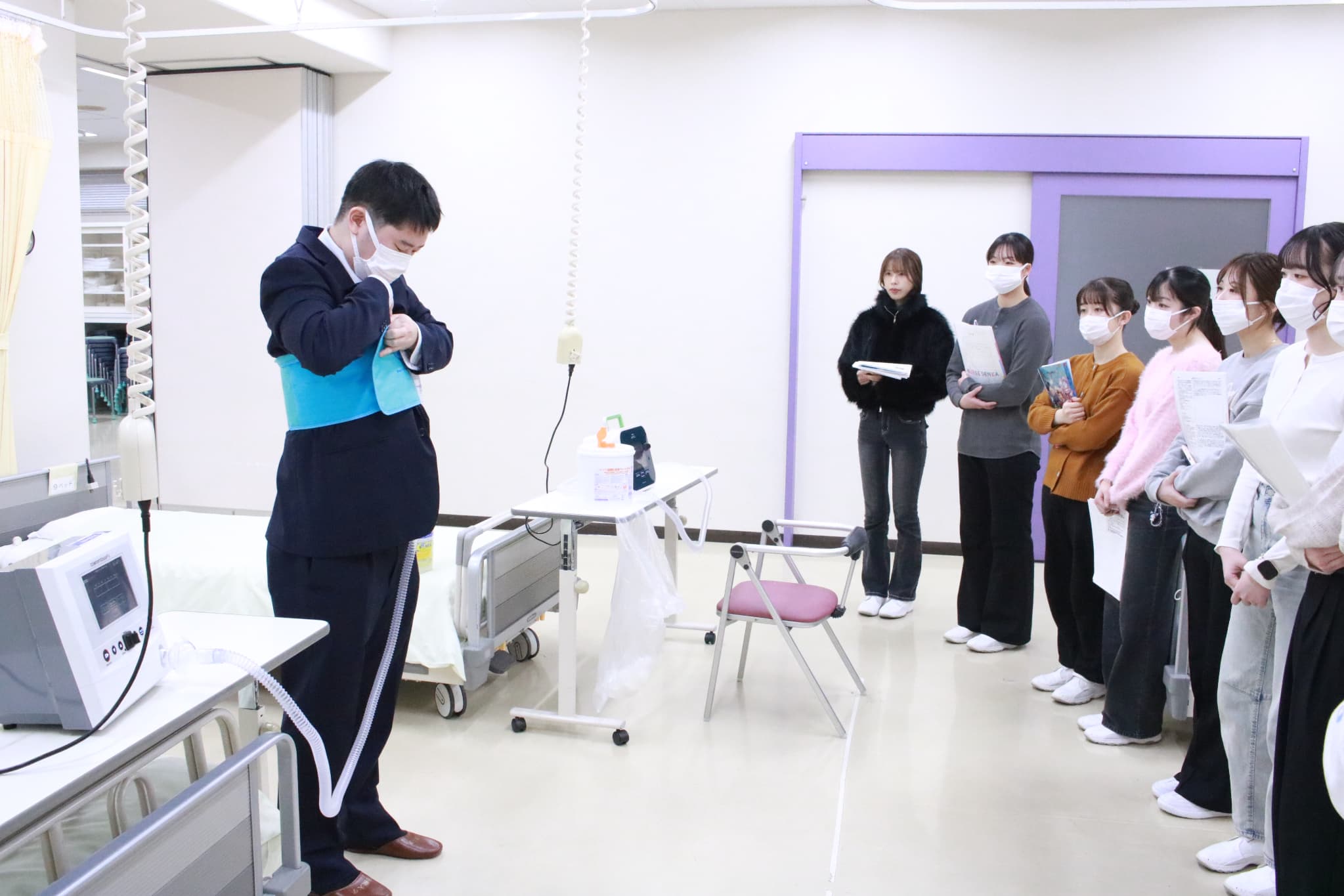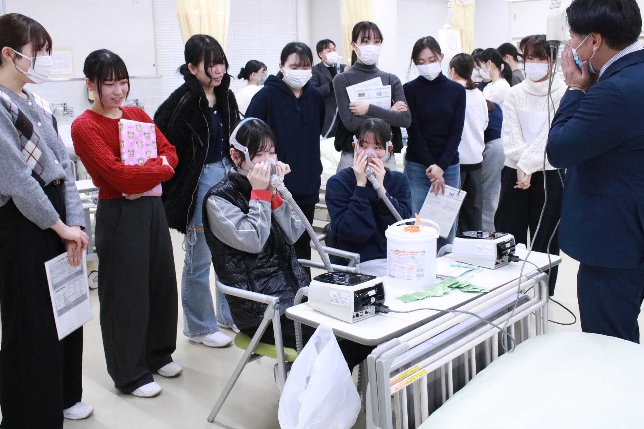 在宅酸素機器を取り扱うエア・ウォーター産業・医療ガス株式会社の担当の方から、在宅酸素療法に関する講義を受けた後、実際に機器に触れて体験しました。在宅酸素療法を行うための酸素濃縮装置について説明を聞きながら使用方法を学んだ他、気管挿管や切開をせずに空気を送り込む非侵襲型人工呼吸器のマスクの適切な装着や、痰を出しやすくする排痰装置の装着を体験しました。