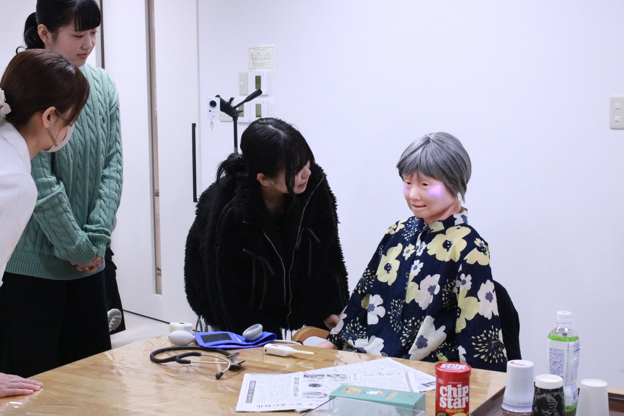 「シナリオ」は患者さんの疾患やそれにまつわる血圧や呼吸の状況など健康状態をモデルに設定し、学生は実際の反応からモデルの患者さんの状態を判断し、臨床判断能力を育てるシミュレーターです。今回は在宅で療養している事例を設定し、学生は実際の訪問看護の場面を想定して声掛けや観察を行い、モデルの反応から健康状態を判断する体験をしました。代表して訪問する学生や家族役を担う学生の場面を、他の学生は観察者として一緒に体験し、終了後に録画した場面を全員で振り返りました。学生は、それぞれに気づいた観察の視点や判断を出し合い、互いの気づきから学びを深めていました。