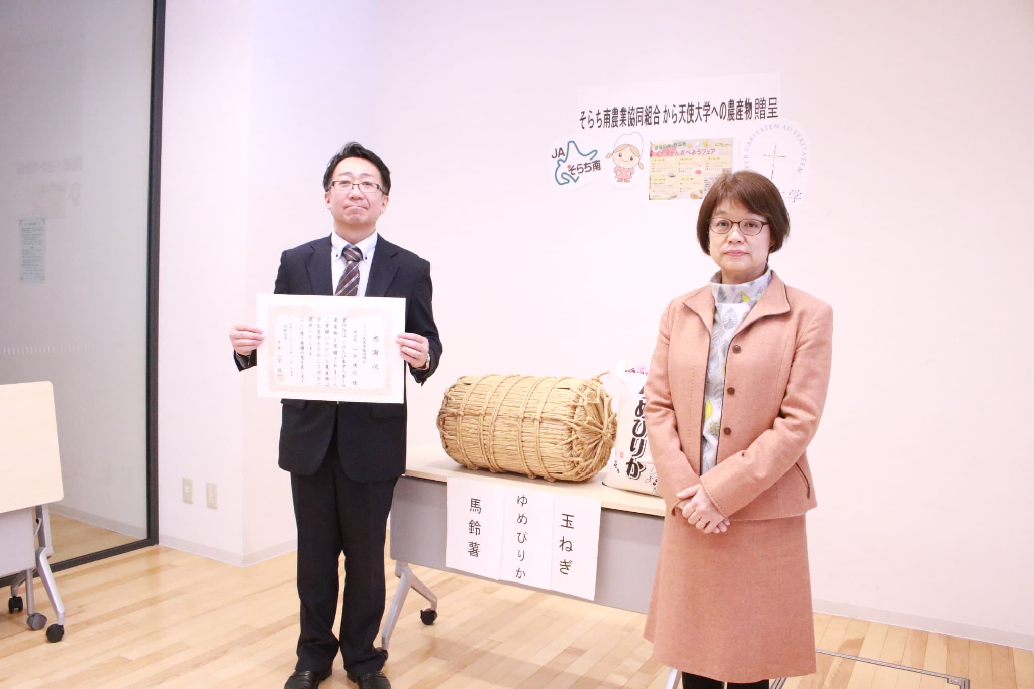 当日は、そらち南農業協同組合 管理部次長 井上聡様が来学され、本学学長からの感謝状等を、学生部長 清水真理、事務局学務課長補佐 渡邉泰央より贈呈いたしました。