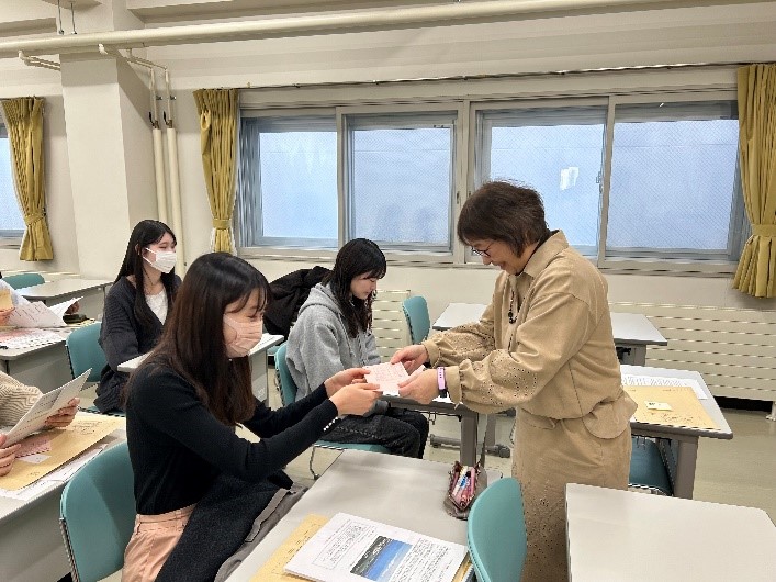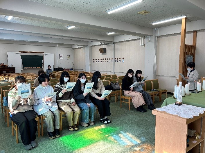 2026年2月10日(火)、保健師国家試験を受験する大学院看護栄養学研究科看護学専攻保健師コース2年生7名の合格を祈願しチャペルでお祈りの時間をもちました。聖書の言葉とお話、黙想、平和を求める祈りを唱え、いつくしみ深きを歌いました。主の見守りのなかで、受験生それぞれが試験で力を発揮できるように、教員から直接受験票と応援グッズを手渡し、エールを送りました。