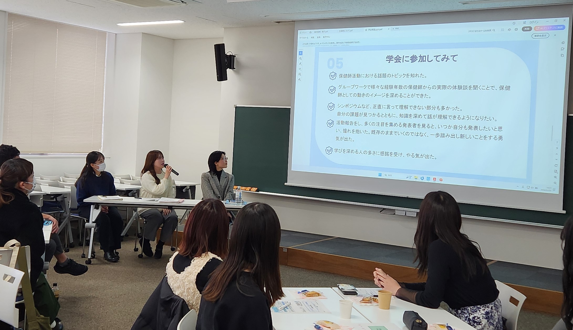 今回は保健師1年目の修了生3名から、働く現在の様子について報告があり、参加した先輩からは、1年間働き続けられたことを大切にこれからへのエールが送られていました。また、昨年12月に石川県で開催された日本公衆衛生看護学会学術集会に参加し、課題研究論文を発表した報告もあり、学会に参加した学びも含めて参加者と共有し刺激を受けていました。